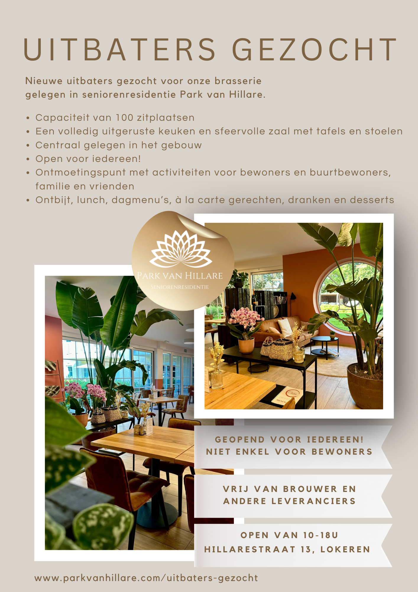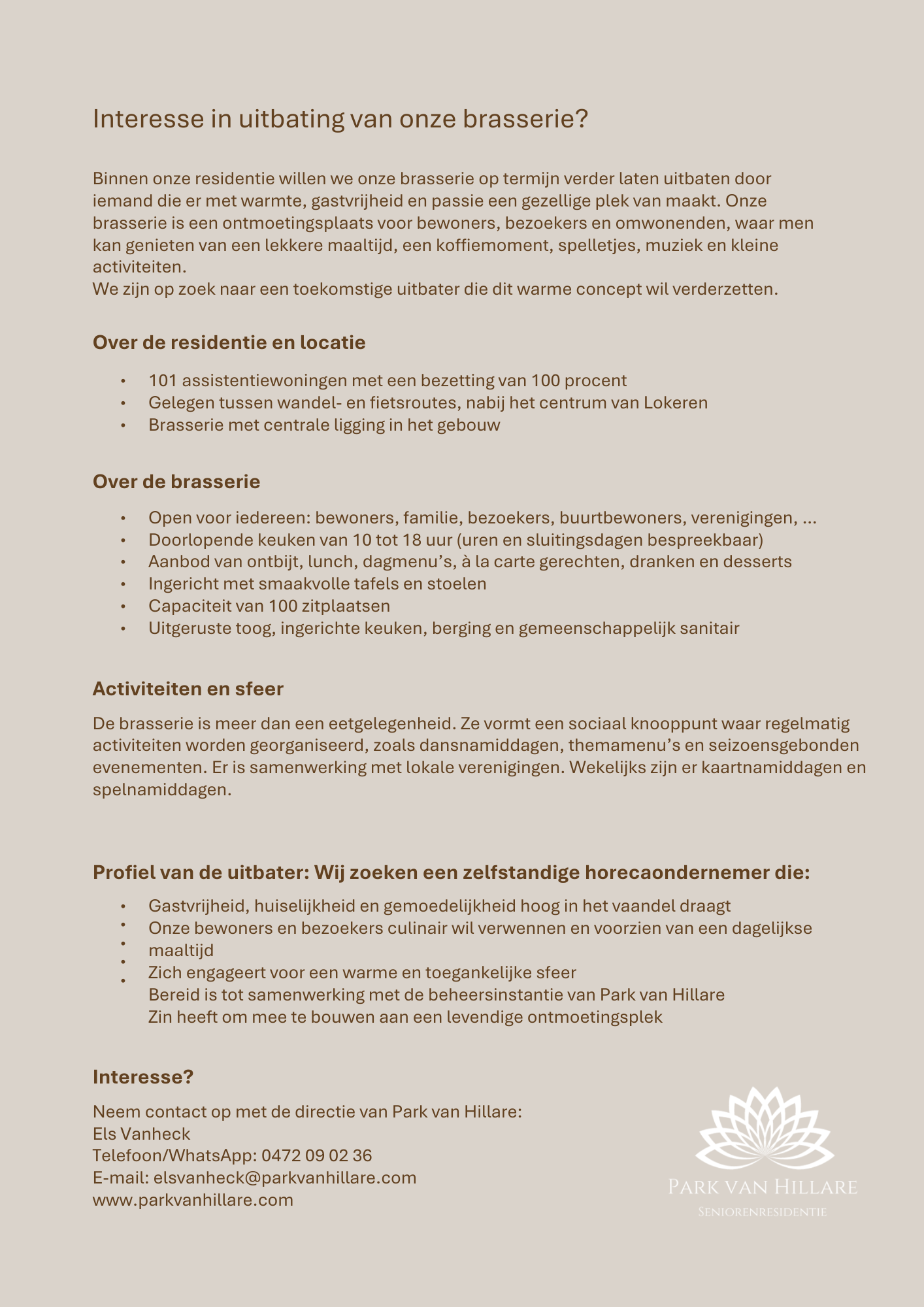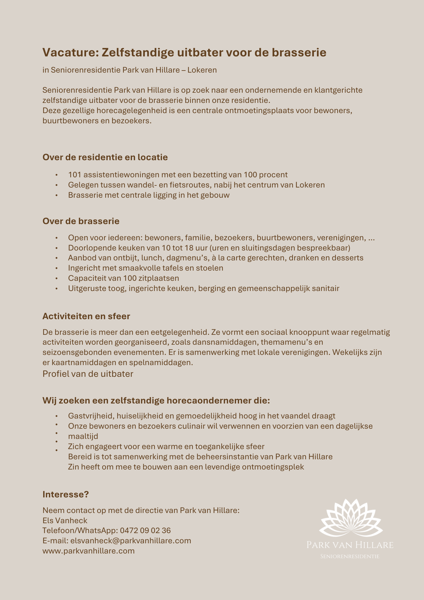 Wij zoeken een gemotiveerde overnemer voor onze sfeervolle brasserie, gelegen in het hart van het Park van Hillare – dé ontmoetingsplaats voor onze residenten en bezoekers.